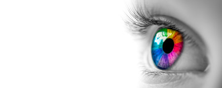 close up view of human colorful eye looking away in darkness, panoramic shot