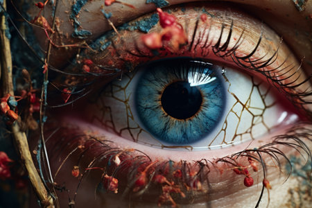 Photo of a painted eye of a girl looking at the camera through a hole on a blue background