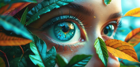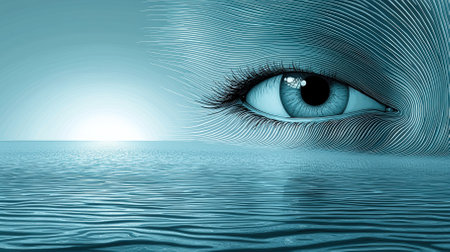 Close-up of an eye reflecting a vast landscape through a captivating double exposure technique