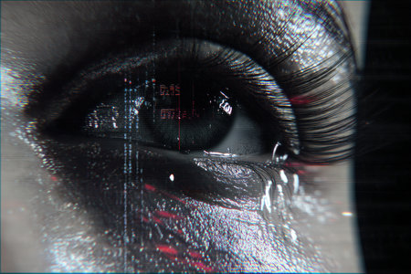 Captivating close-up of a pair of striking blue eyes surrounded by dynamic water splashes, emphasizing emotion and beauty in a macro style.