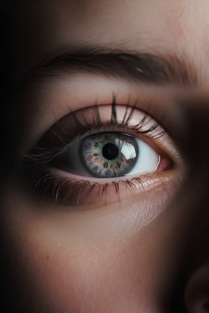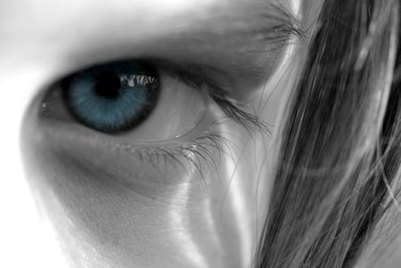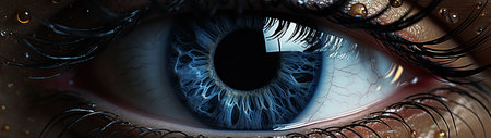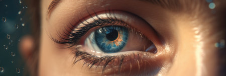 Close-up shot of beautiful woman's blue eye with long eyelashes