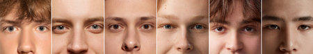 Vertical collage of open eyes of young multiethnic men and women on multicolored background. Concept of youth, unity, equality and diversity