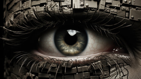 An extreme macro shot of a human eye, featuring a detailed iris with brown and orange hues and a...