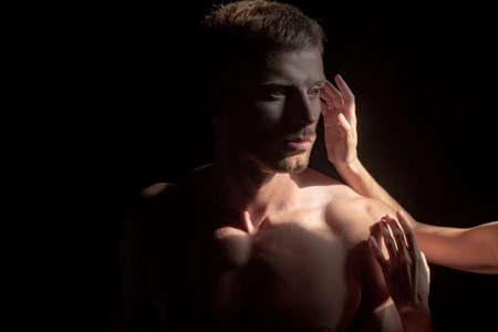Sexy man or muscular macho, bodybuilder, with muscle torso, body with six packs and abs poses.