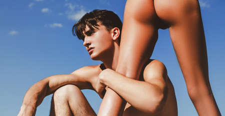 Man muscular chest torso stand sky background. Strong muscles emphasize masculinity sexuality. Bodybuilder shape. Sexy torso attractive body. Man muscular athlete bodybuilder show muscles