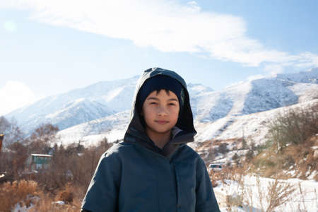 happy boy walking in sunny mountains children's clothing for the mountains close smiling portrait with copy space