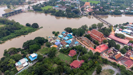 Tha Ruea, Ayutthaya, Thailand - October 2021: Flood waters overtake a house and rice field in area around Rama 6 Dam (Phra Narai Gate). Many buildings are submerged in water. Photo disaster from drone
