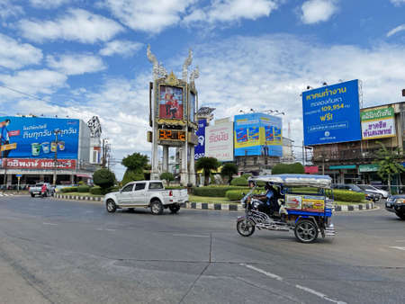 Udon Thani, Thailand - November 19, 2019: Street life and traffic scene at a roundabout in center of Udon Thani, city of north east Thailand