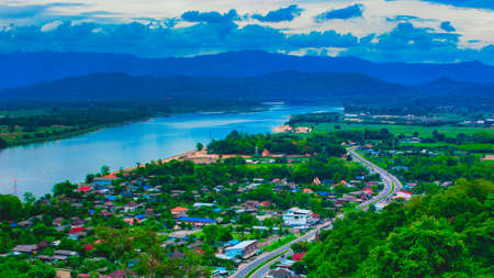 Aerial view from a drone that shows the border town of Mae Sai District, Thailand, And international immigration Tachileik District Of Myanmar