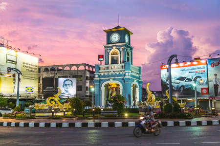 PHUKET, THAILAND - 30TH MARCH 2017: An old clock tower on a roundabout in Phuket City. People can be seen on a scooter.