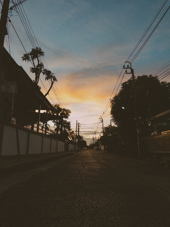 Urban road in Thailand shown during twilight, framed by palm trees on both sides and a glowing orange sky overhead, capturing the quiet stillness and atmosphere of evening in a tropical urban setting.