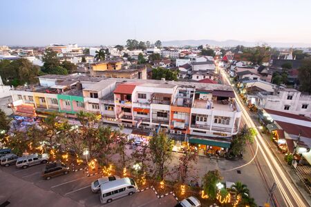 Aerial view of Chiang Rai City at dusk, bright and glowing neon lights and lights trails on the streets, tourist attractions in Thailand. Long exposure.