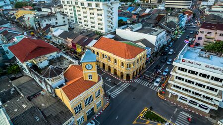 Phuket, Thailand - January, 01, 2017 : aerial photography above Charter intersection there have the antique architect in the middle of Phuket city.