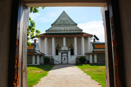Religious building with a triangular roof on blue sky with red decor. Ayutthaya Thailand.