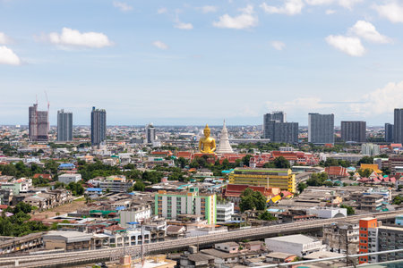 Aerial view of Wat Paknam Bhasicharoen, a temple, pagoda and Buddha statue in Bangkok Thailand