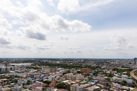 BANGKOK,THAILAND- AUGUST 13, 2021 : The cityscape top view of Tha Phra is a new mrt station in thonburi district
