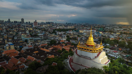 'Golden Mountain ' Wat Saket Ratcha Wora Maha Wihan popular Bangkok tourist attraction , Landmarks of bangkok Thailand . In the rain before , topview