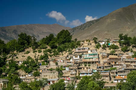 View of the houses on a mountain slope in Chitral - small town in northern Pakistan, in the Hindu Kush mountains