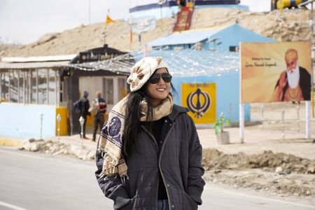 JAMMU KASHMIR, INDIA - MARCH 20 : Travelers thai woman travel visit and posing for take photo at Gurudwara Pathar Sahib on Srinagar highway at Leh Ladakh on March 20, 2019 in Jammu and Kashmir, India
