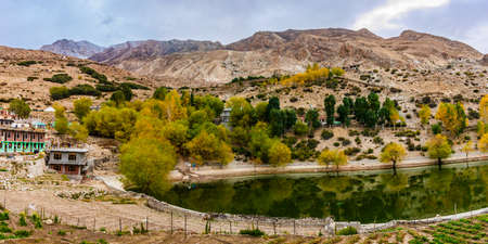 Nako Lake aerial view from Nako Village Top. Nako Lake is a high altitude lake located at 3662m from sea level in Kinnaur region of Himachal Pradesh, India