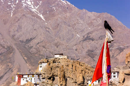 A yellow billed chough aka Pyrrhocorax graculus perched on the red flag of the ancient Buddhist monastery in the village of Dhankar in the Spiti valley in Himachal Pradesh, India.