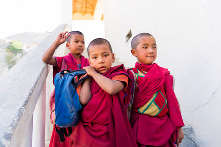 Diskit, India - August 20, 2015: Three young monks leaving Diskit monastery school. The school has computer facilities and teaches science subjects, in English, to Tibetan children of the region.