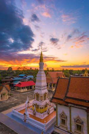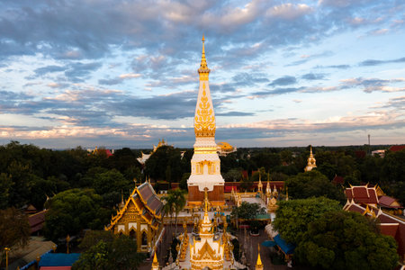 Aerial view of Phra That Phanom temple at twilight in Nakhon Phanom, Thailand.