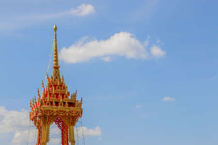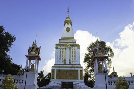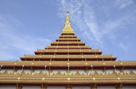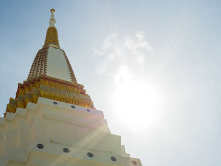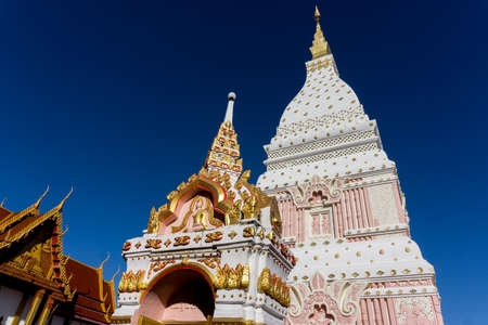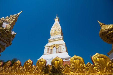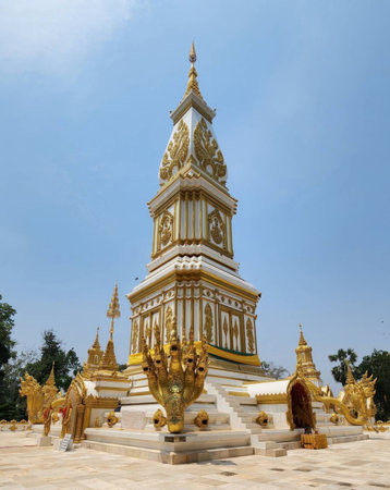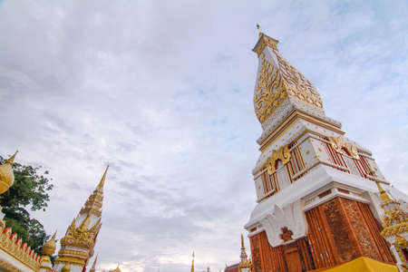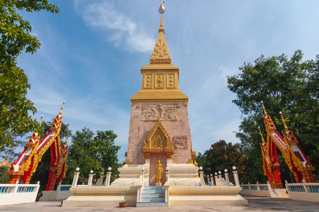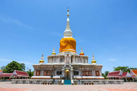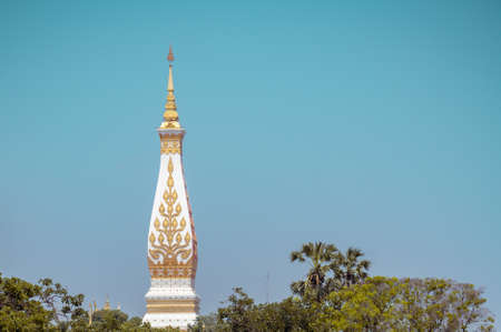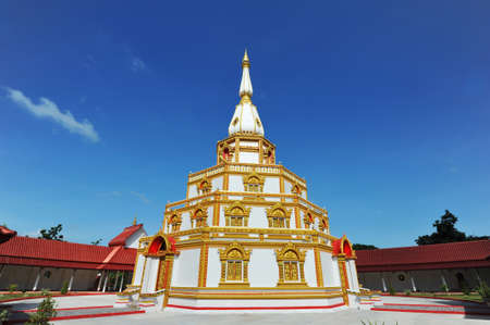 Stupa in Thai Buddhist temple over the blue sky background. Nakonpanom province in Thailand