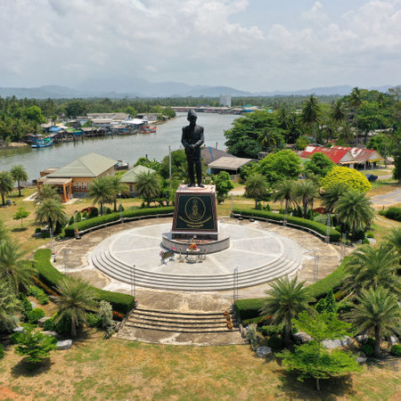Aerial: Bang Riang Buddhist Temple. Popular Touristic Place in Phang Nga Province, Thailand.