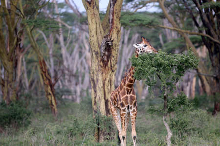 Family of wild giraffes on the lake Naivasha. Africa. Kenya