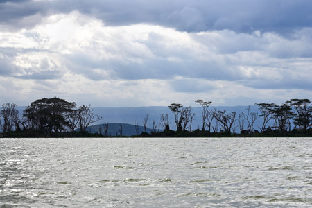 Stunning scenery of Lake Naivasha with flooded trees against the background of the dramatic sky. Kenya, Africa