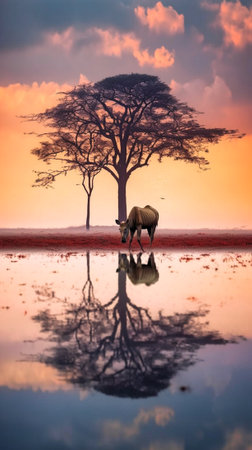 Experience the serene beauty of an African sunset where acacia trees stand gracefully silhouetted against a vibrant sky, creating a tranquil and picturesque landscape.