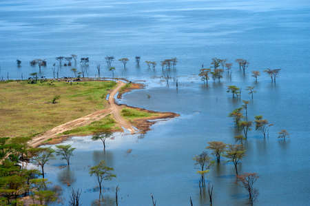 Landscape of Lake Naivasha with flooded and abandoned buildings of the hotel. Kenya, Africa