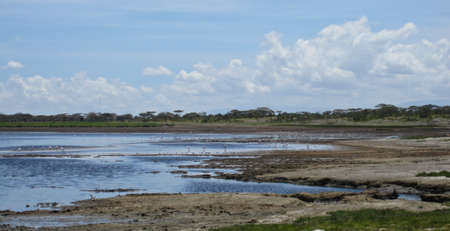Birds are walking in shallow water, fishing. Patches of green grass on the water. In the distance, on the lake, a flock of flamingos is visible. Kenya. Amboseli Park.