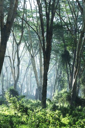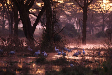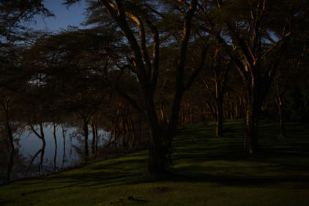 Evening twilight. East African Rift Valley. Gentle sunlight illuminates the half-flooded trees. Journey to the exotic country of Kenya. Lake Nakuru Park in central Kenya in East Africa.