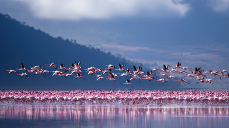 Gorgeous pink flamingos flying above the lake, Amboseli National Park, Kenya