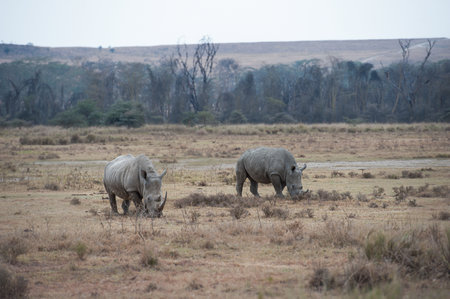 Picturesque pair of wild African rhinos goes to the lake to drink. African prairies on the shores of Lake Nakuru. The Horn of Africa. Great Rift Valley. The famous African Big Five