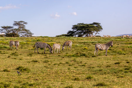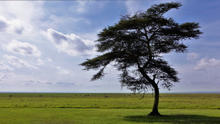 Umbrella acacia in the savannah against the blue sky. Green grass all around. Zebras and wildebeest graze in the distance. Kenya. Amboseli park.