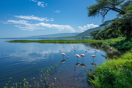 A flock of pink flamingos standing by a serene lake under a clear blue sky. A beautiful scene of nature, perfect for ecology, wildlife, and travel-related projects.