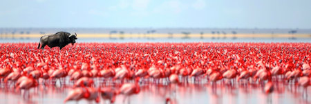 A buffalo casually roams through a vast wetland, surrounded by numerous pink flamingos grazing peacefully.