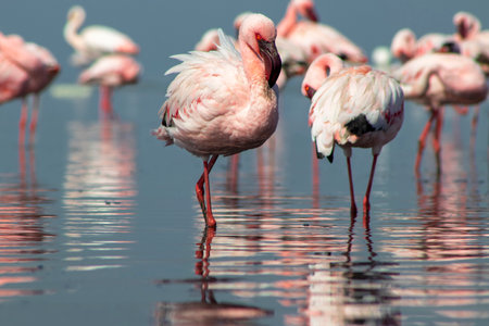 Flamingo wobble their legs as they look for the shell fish that give them their color. Serengeti national Park, Tanzania
