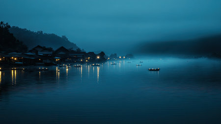 A tranquil twilight scene capturing a misty lake surrounded by gentle hills, where boats float and distant lights create a calming atmosphere.