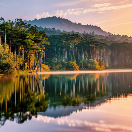 This serene image captures a quiet forest scene with a still lake reflecting the surrounding trees and misty mountains, evoking a sense of tranquility and peace.