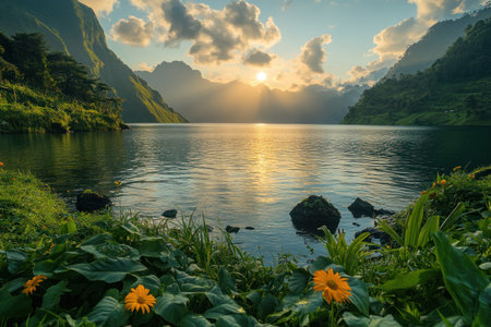Cinematic view of a tranquil lake nestled among majestic mountains at dawn