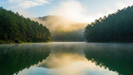 Discover the tranquil beauty of a serene forest lake, surrounded by towering evergreen trees and enveloped in mysterious fog. This peaceful scene invites reflection and relaxation in a captivating natural environment rich in greenery and calm waters.