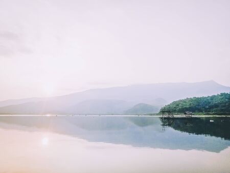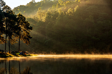 Pine forest with reservoir while the sun shines in the morning at Pang-ung, Mae Hong Son Province, North of Thailand. Tourist place where people come to vacation in the winter.