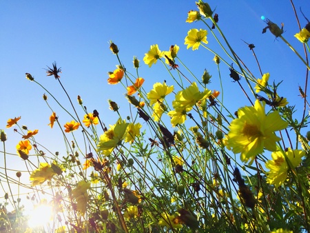 Colorful cosmos flowers blooming in the garden with blurred background.