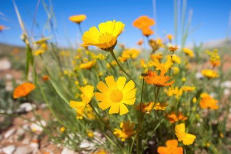 A breathtaking close-up view of vibrant wildflowers showcases various blooms under a bright blue sky. The scene captures the essence of nature's beauty, emphasizing fresh petals and green foliage. Perfect for evoking feelings of joy and tranquility.