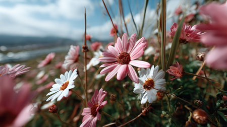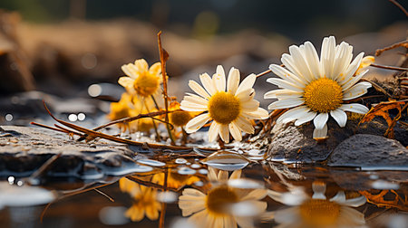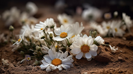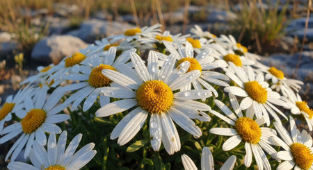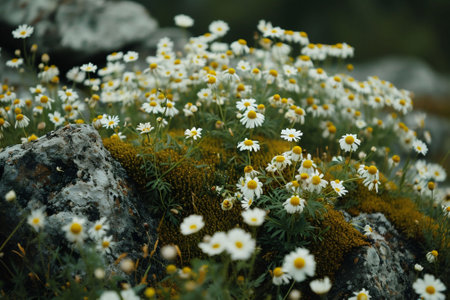 Dainty wild daisies flourishing among moss covered rocks, a serene snapshot of rugged beauty and resilience in nature. High quality photo