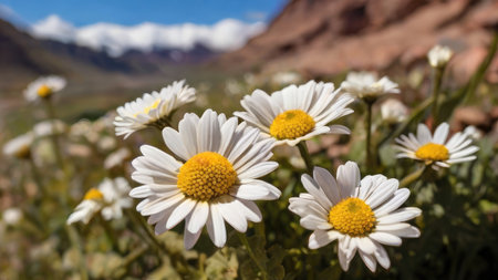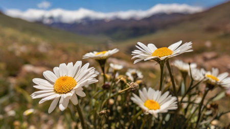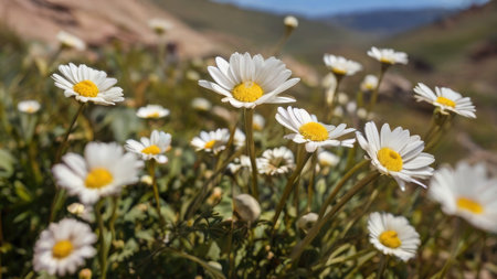 A vibrant field of white daisies with yellow centers flourishes in a sunny mountain meadow.